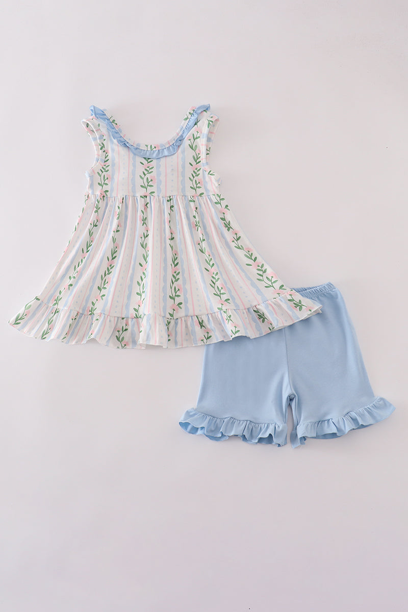 Get ready to bloom in style with our Blue Floral Ruffle Shorts Set! Featuring a playful blue floral print and flirty ruffle detailing, this set is perfect for any summer occasion. Comfortable and stylish, it's a must-have addition to your wardrobe!