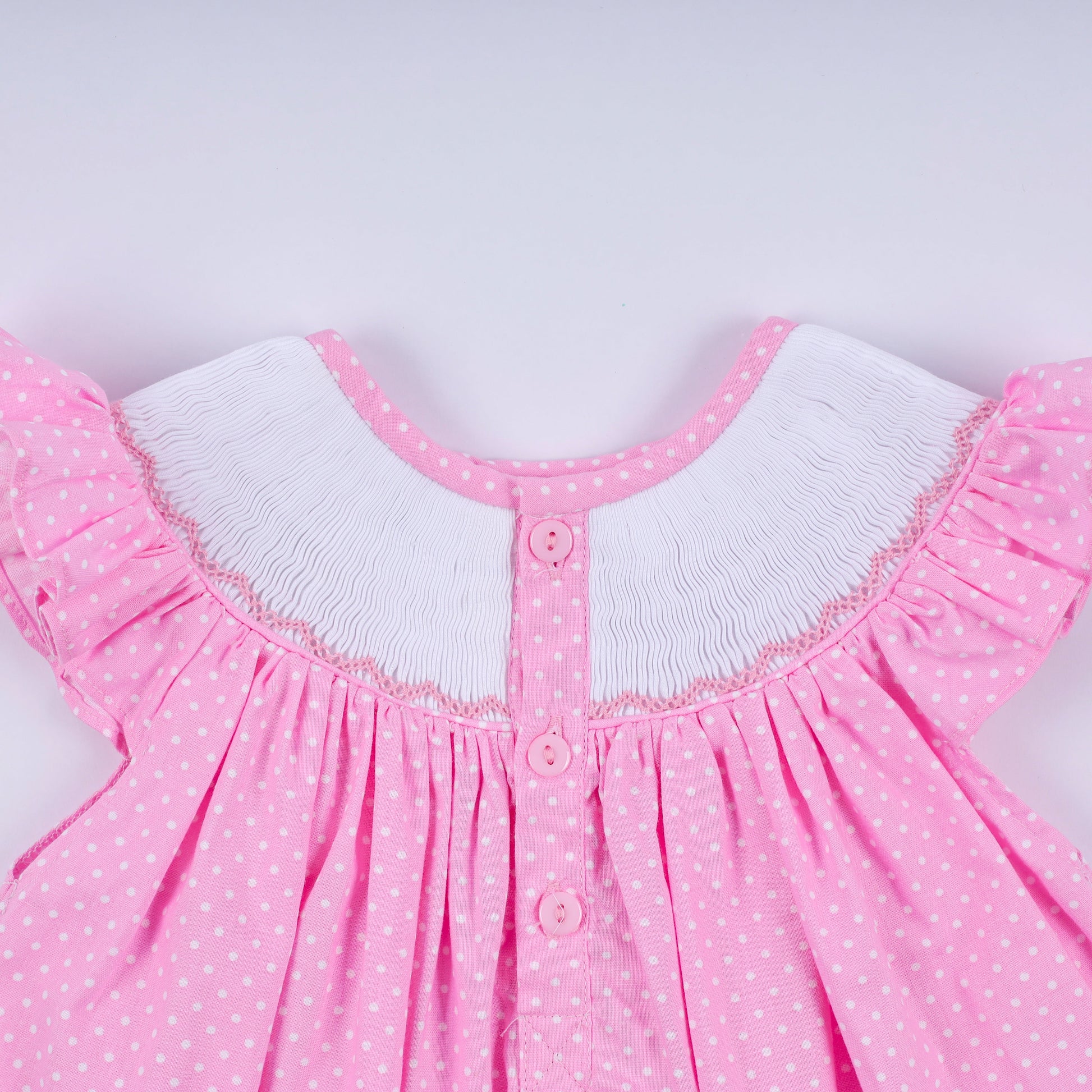 Pink character hand smocked dot ruffle bloomer set