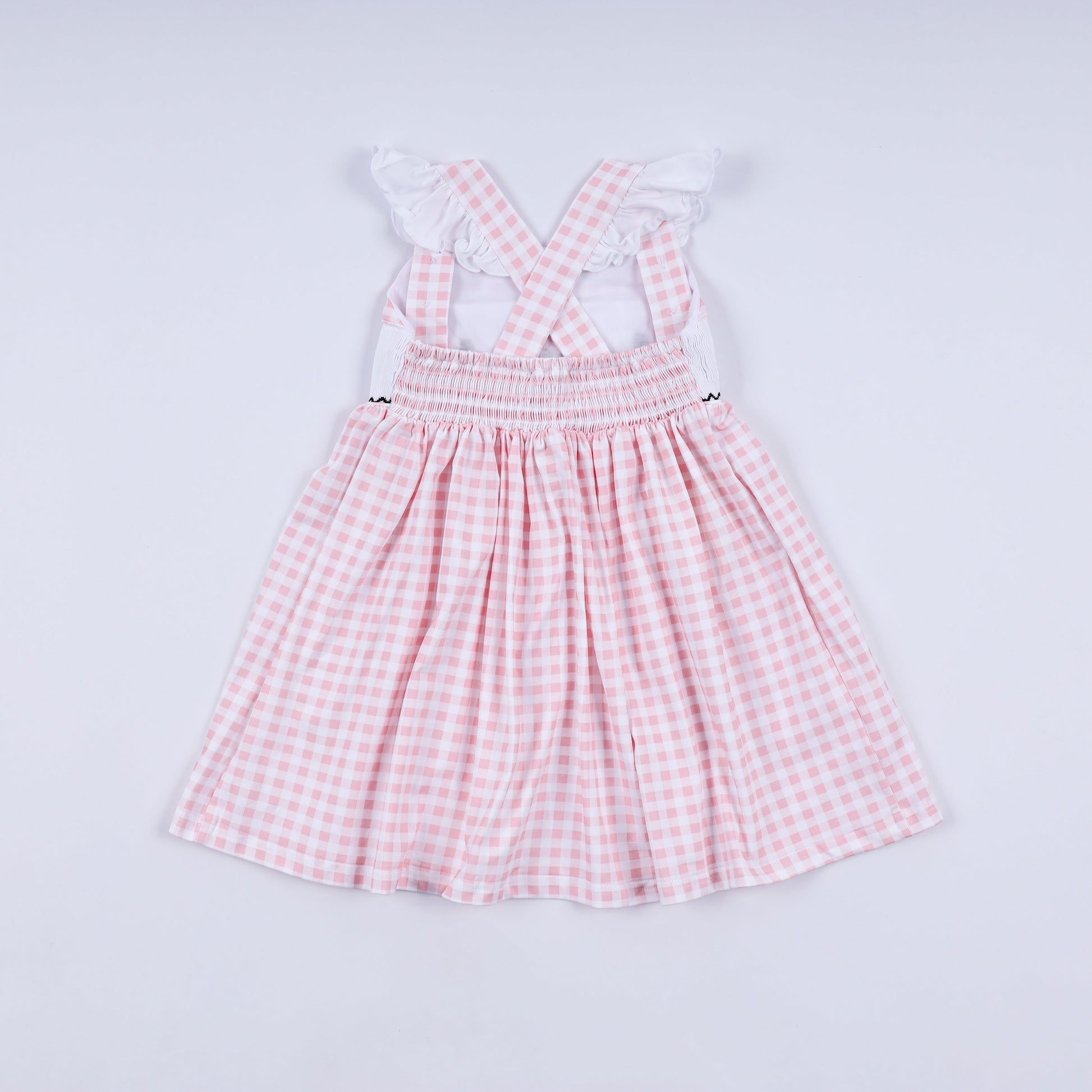 Meet the dress that's as charming as it is twirl-worthy! This pink gingham ruffle dress features adorable character details and hand-smocked craftsmanship that adds texture and personality. The playful ruffles dance with every movement, while the classic gingham pattern keeps things sweet and timeless. Perfect for special occasions or everyday adventures, this dress combines whimsical character charm with quality construction that parents love. A delightful choice for little ones who love to express their unique style.